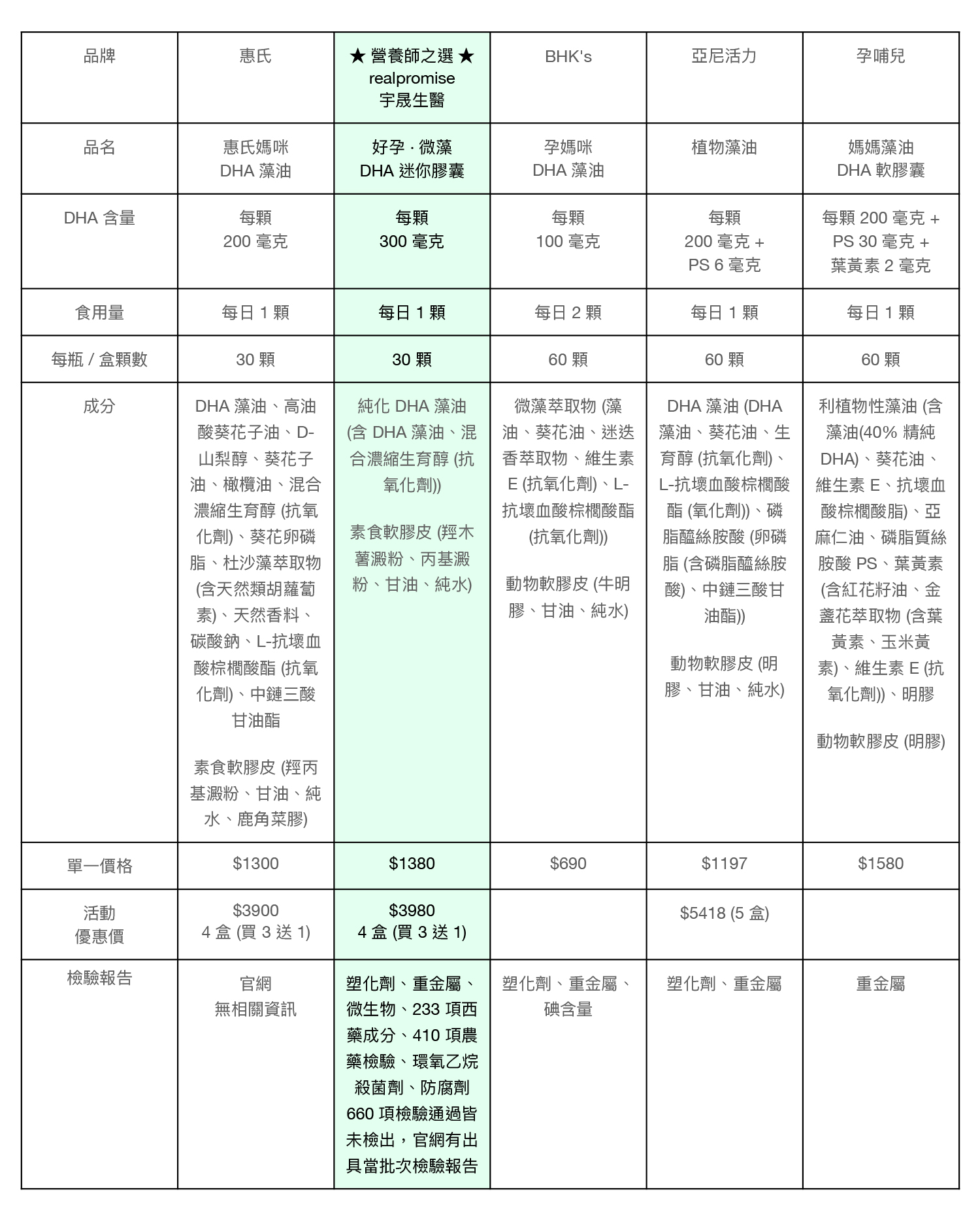 綜合上面的敘述,目前 realpromise 宇晟生醫的「好孕 · 微藻 DHA 迷你膠囊」是最符合我建議的孕期 DHA 藻油產品,每顆 300 毫克有符合「美國孕婦協會」與大多數機構的建議量,此外,「好孕 · 微藻 DHA 迷你膠囊」是目前我看到最純的藻油,濃度高達 70%,也沒有添加其他無意義的填充油脂成分,最重要的是,全批次都有第三方實驗室的完整檢驗報告,符合我的高標準要求。以上是根據我個人的專業與經驗提出的看法,供孕媽咪參考,所有資訊都來自品牌方的官網與資料。